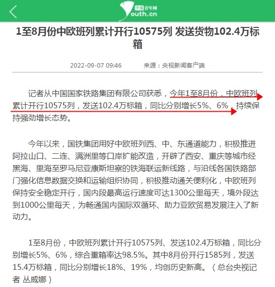 值得一提的是,近日,记者从中国国家铁路集团有限公司获悉,今年1至8月份,中欧班列累计开行10575列、发送102.4万标箱,同比分别增长5%、6%,综合重箱率达98.5%,持续保持强劲增长态势。其中8月份开行1585列,发送15.4万标箱,同比分别增长18%、19%,均创历史新高。