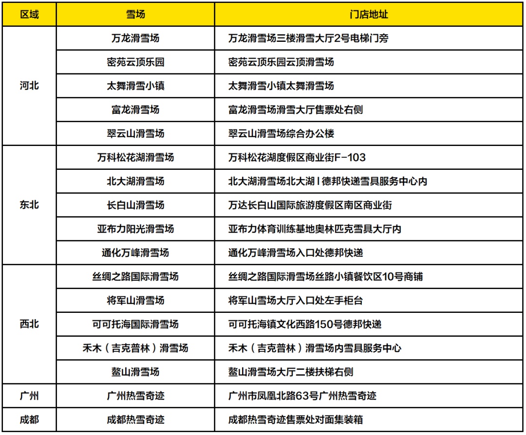目前,德邦雪具达已覆盖17大雪场,开设直营门店,雪具均可直达。在东北北大湖、河北万龙2大雪场,德邦雪具达已落地雪具智能柜,支持雪具储存、存寄一体。