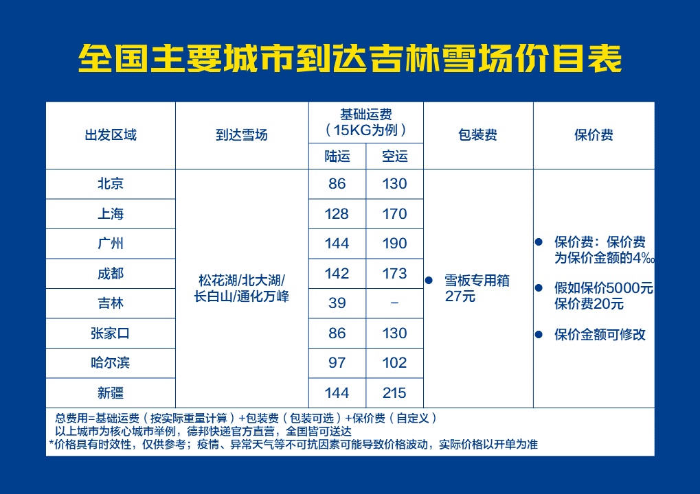 新雪季,为回馈广大雪友,德邦雪具达推出主流线路运费福利,包装费全面让利,以15kg雪板包,运输上海至吉林松花湖雪场为例,陆运运费让利10%,包装费让利25%。全国主要城市到达新疆、崇礼、东北,调整后价目表如下: