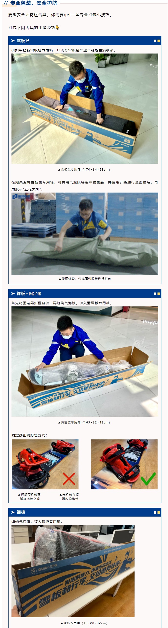 此外,德邦快递还发布了寄送雪具的打包技巧:如果已有雪板包专用箱,只需将雪板包严丝合缝地塞满纸箱。如果没有雪板包专用箱,可先用气泡膜等缓冲物包裹,并使用纤袋进行全面包装,再用胶带缠绕。