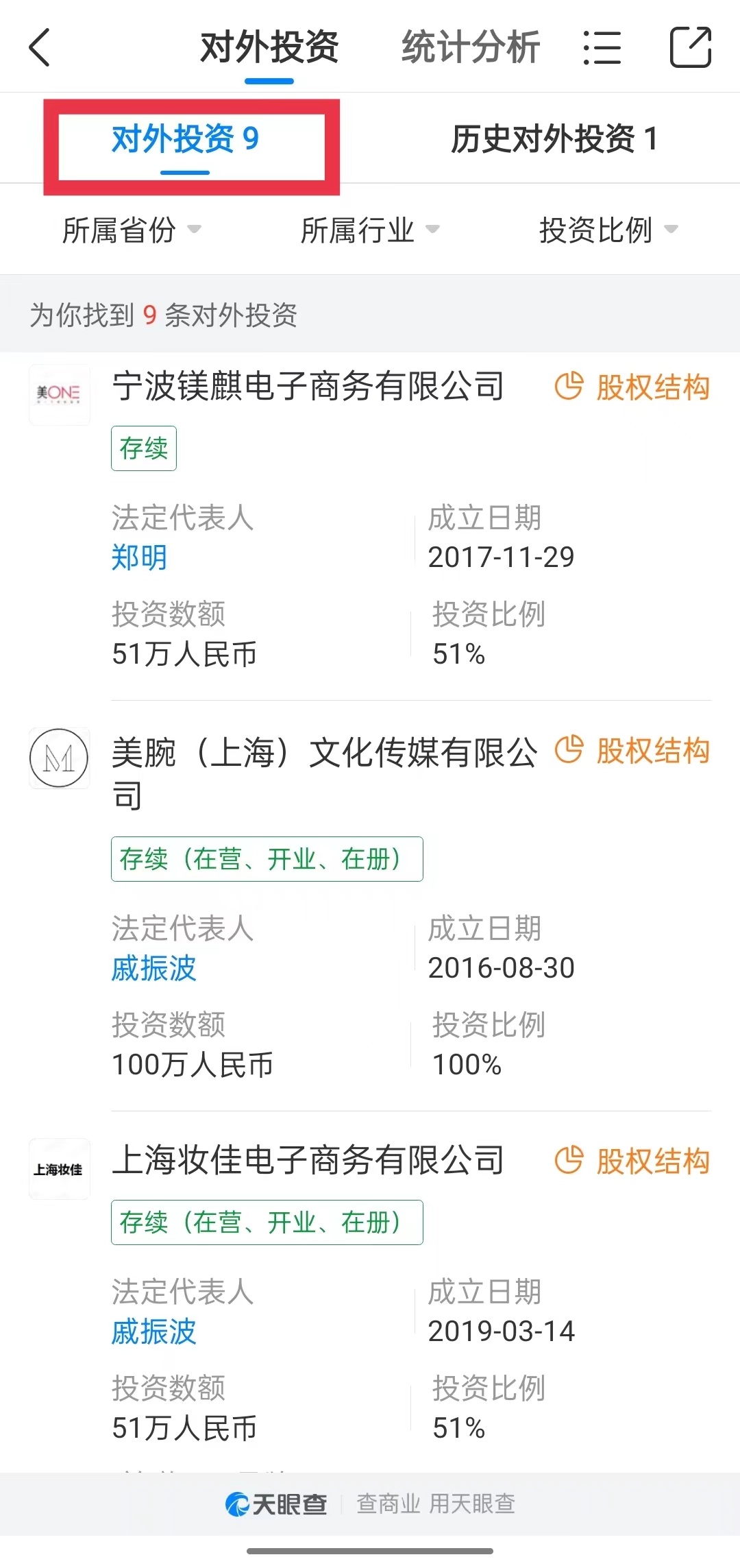 据天眼查不完全信息统计,成立至今,美腕(上海)网络科技有限公司已对外投资9家公司,分布于上海、海南、浙江,包括宁波镁麒电子商务有限公司、美腕(上海)文化传媒有限公司、上海妆佳电子商务有限公司、美腕(上海)新媒体科技有限公司、海南美腕信息科技有限公司、上海奈娃家族品牌管理有限公司等。