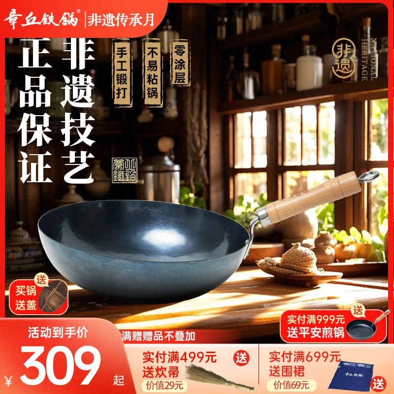 章丘铁锅官方旗舰店无涂层不易沾手工锻打圆底木把轻音炒菜锅家用