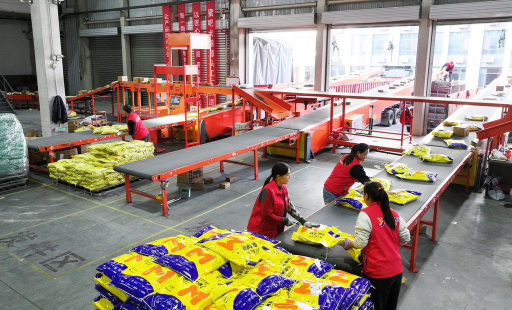 工人根据订单将宠物食品包裹贴上标签放到传送带上