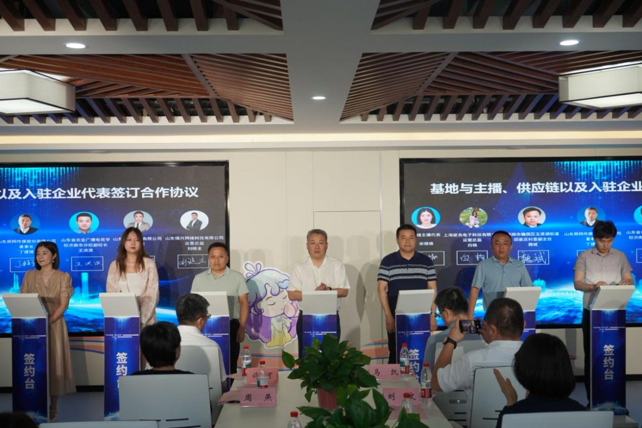 活动现场举行了系列签约仪式:泉城好品直播电商基地与上海得物信息集团签订战略合作协议,将在潮流消费场景搭建、年轻态流量运营等方面深度合作;同时分别与山东省农业广播电视学校济南市分校、槐荫区玉清湖街道田家庄村委在高素质农民主播培育、助力乡村特色产品上行等方面达成合作,还与多家本土知名企业、头部主播代表达成合作。这些合作旨在通过整合优质供应链资源、完善主播孵化体系、打通线上线下渠道,推动电商产业与本土品牌升级深度融合,形成“供应链-直播电商-市场”的良性闭环。